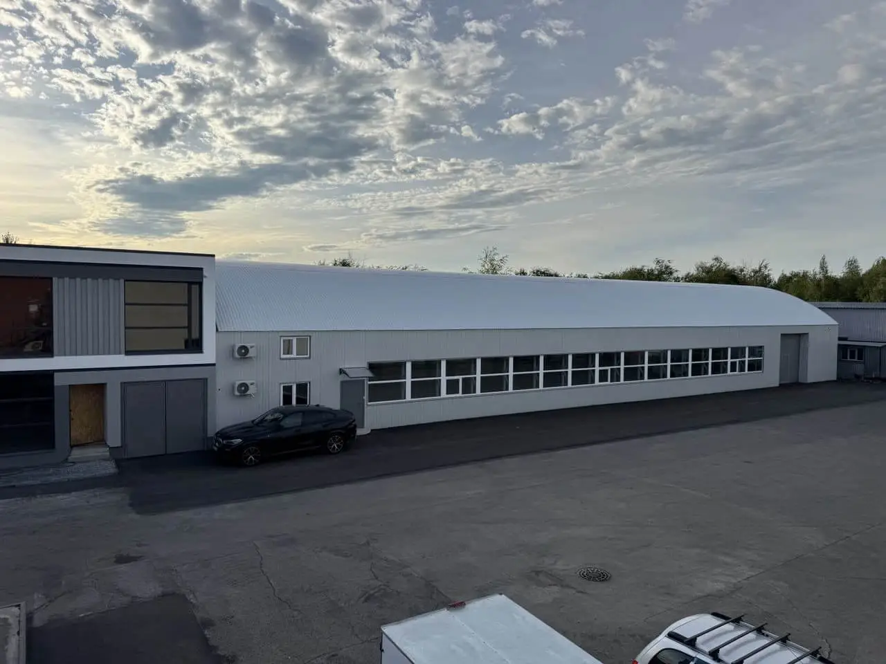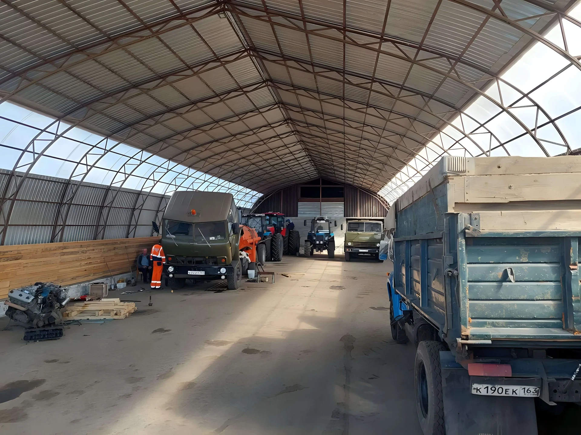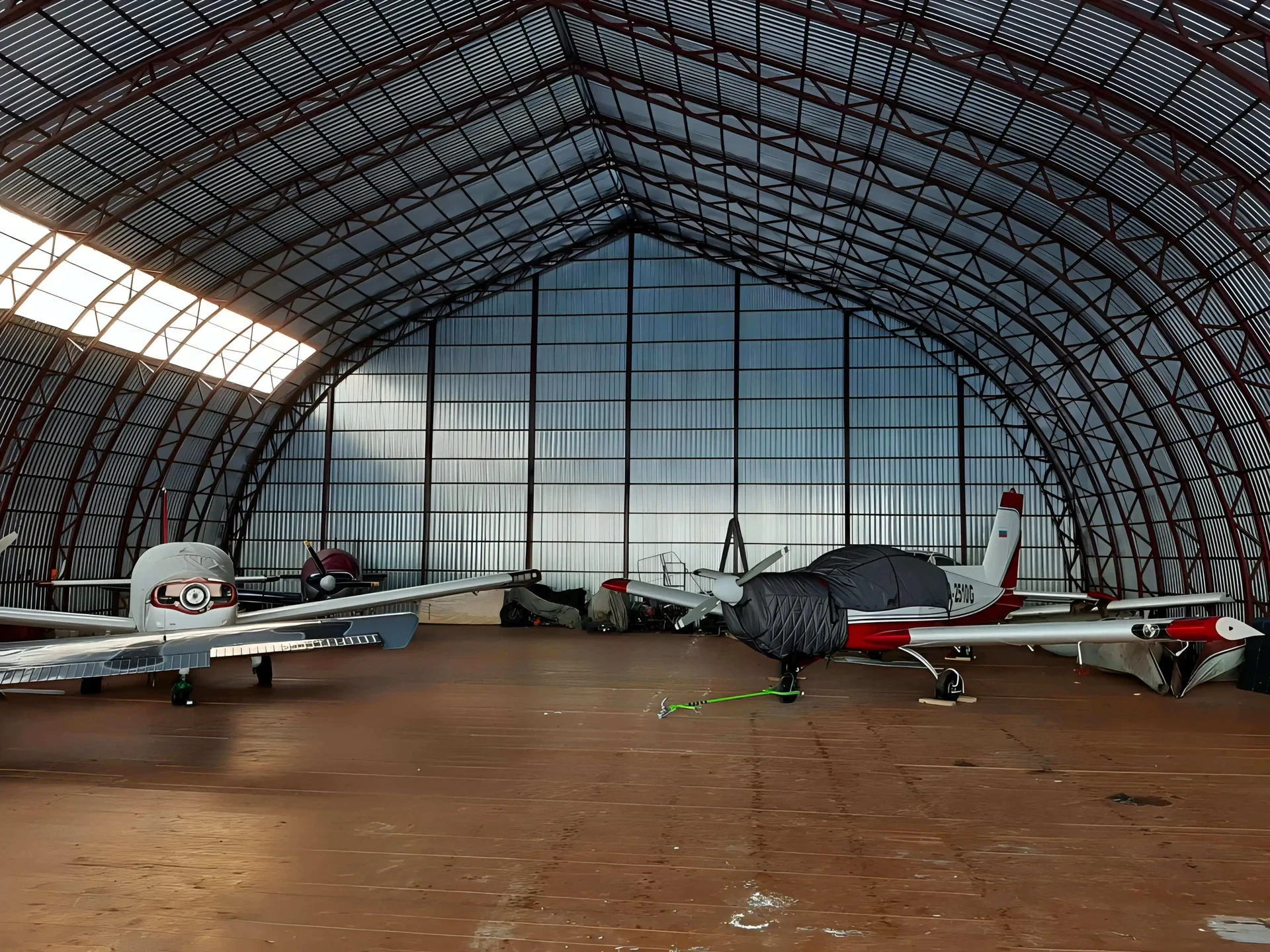 Просторный ангар с высокими сводами и естественным освещением. Прочная конструкция выдерживает интенсивные нагрузки и обеспечивает безопасность круглый год.