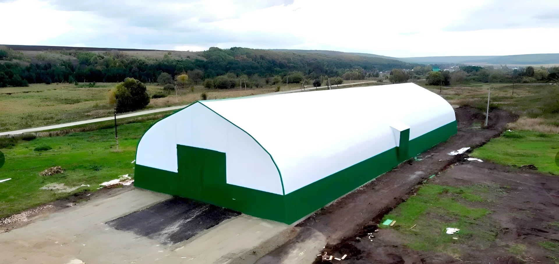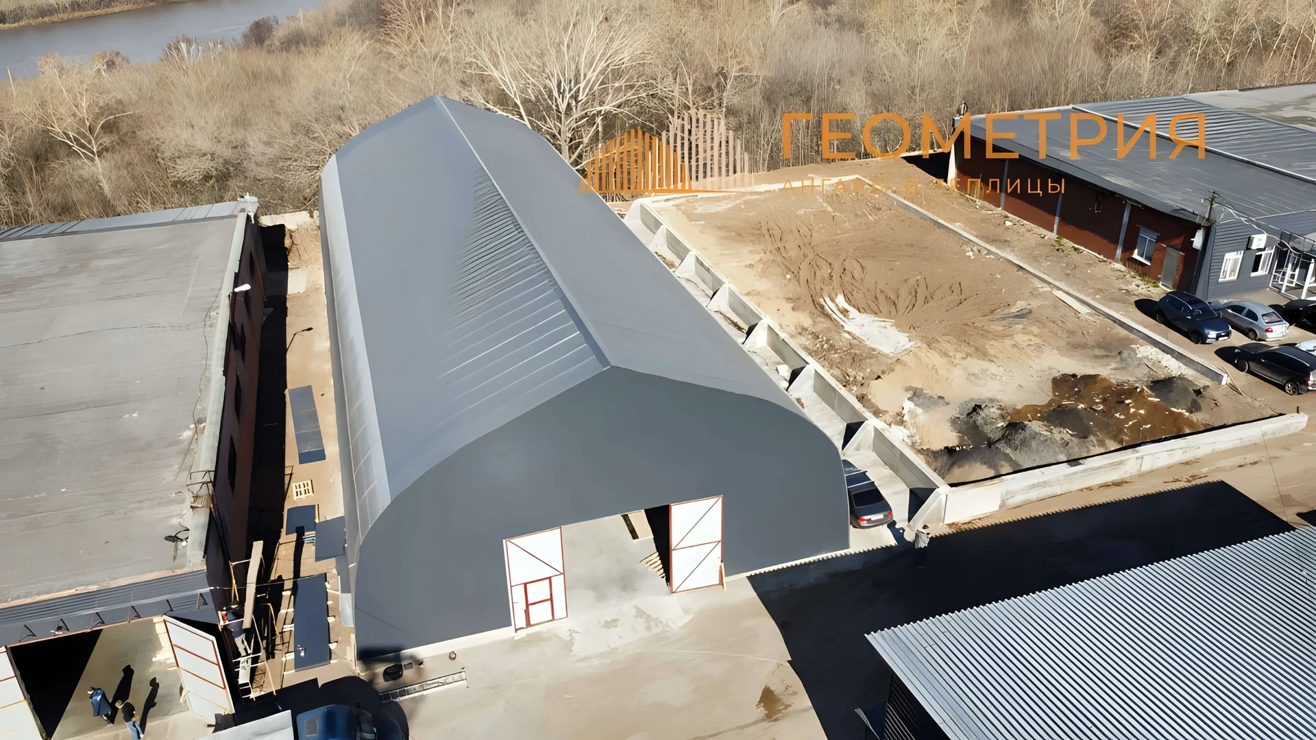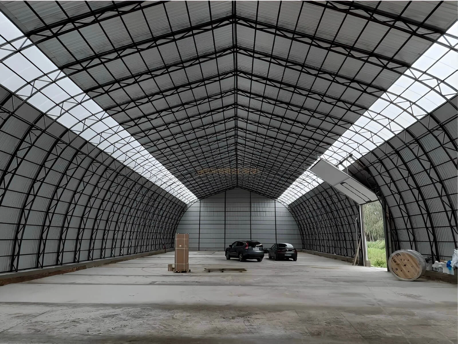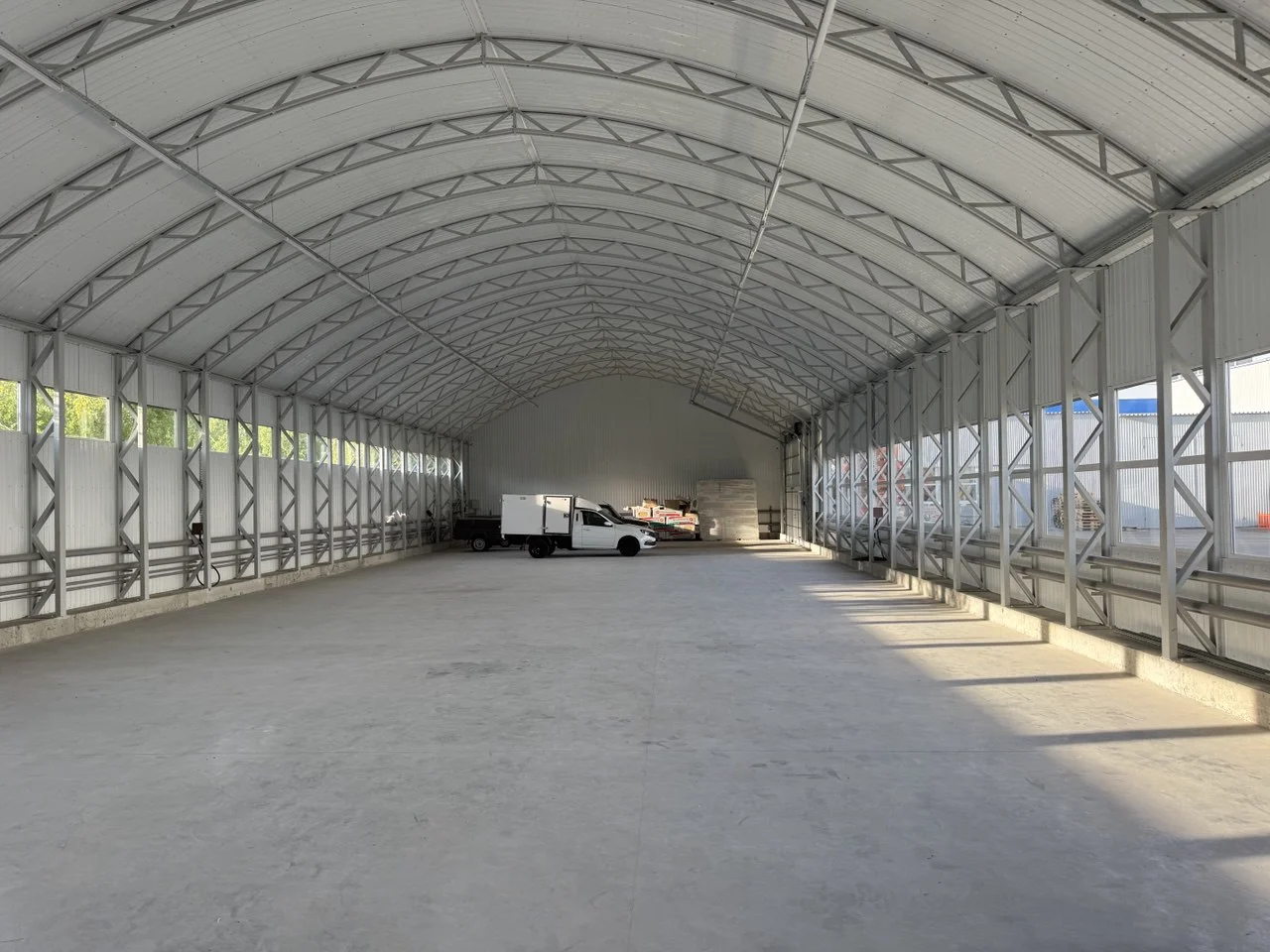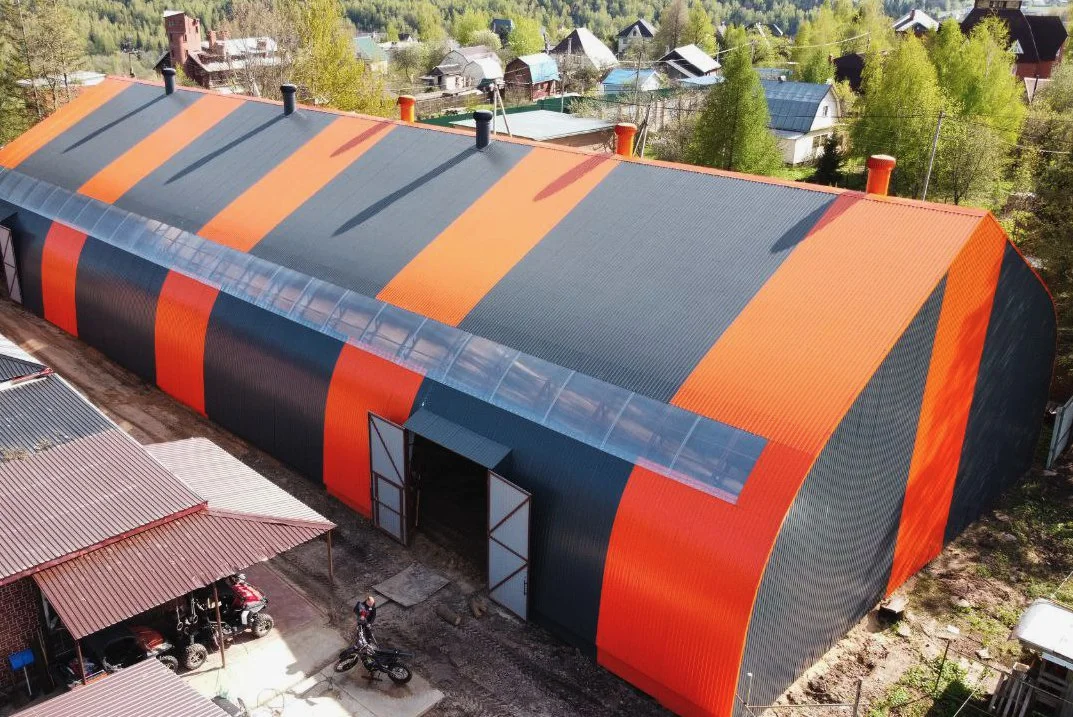 Прочный и светлый арочный ангар с широкими воротами — идеальное решение для хранения техники, оборудования или материалов.