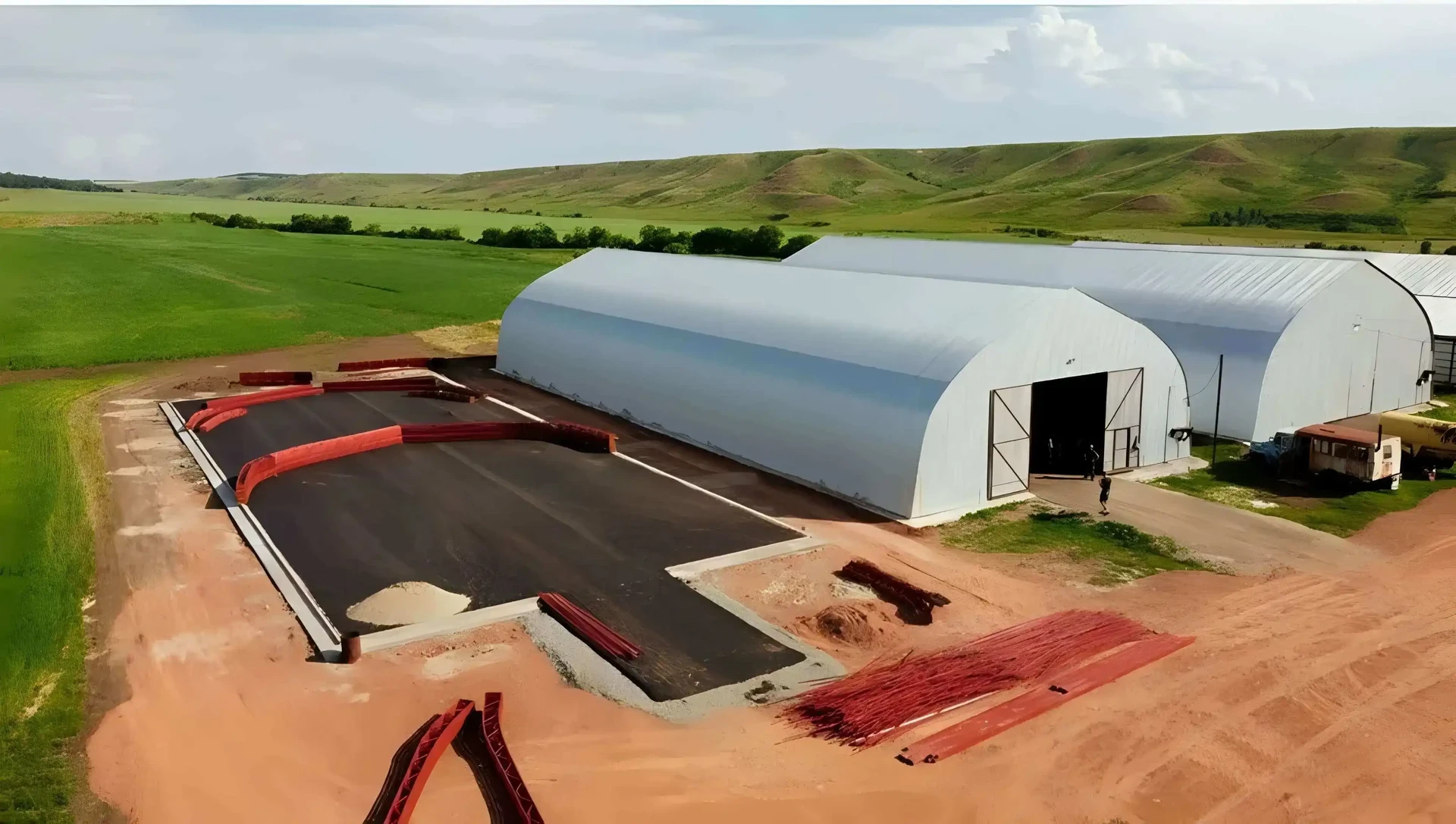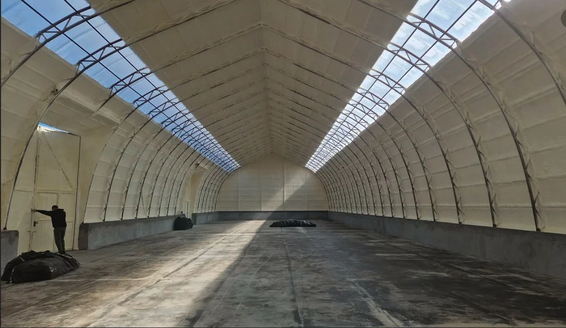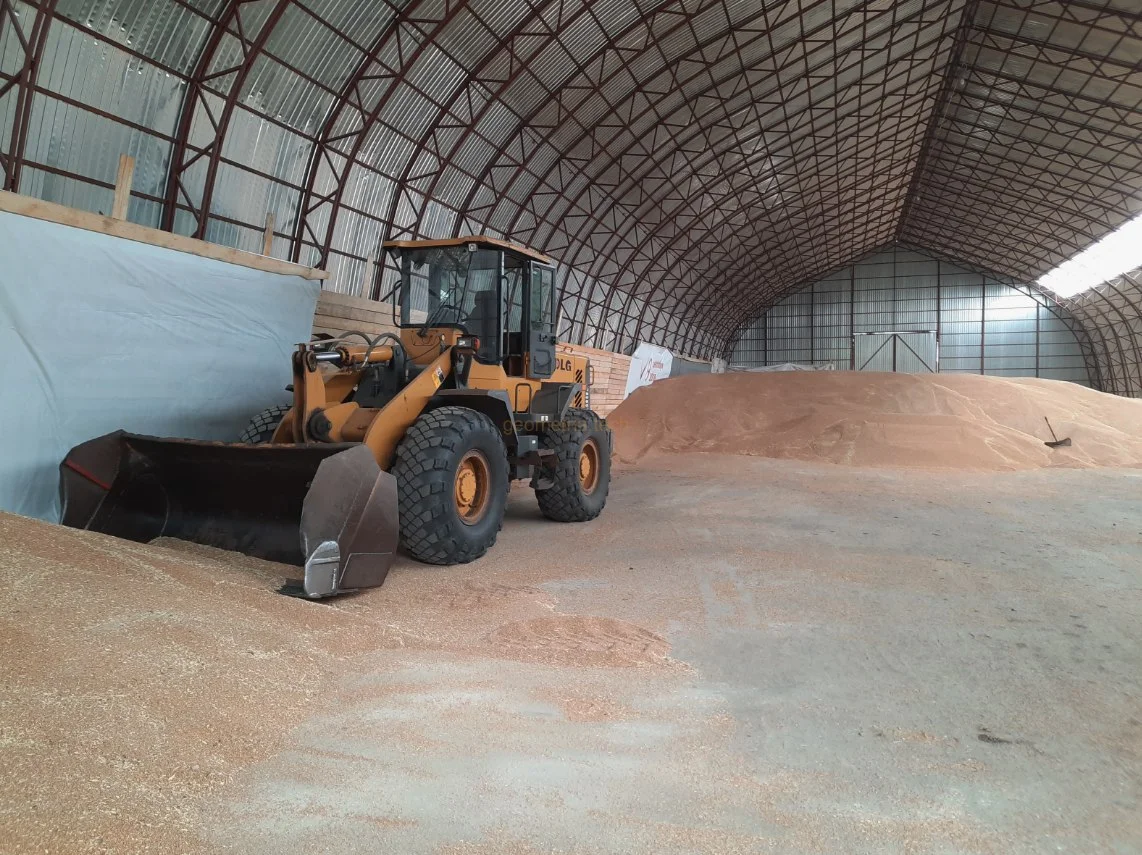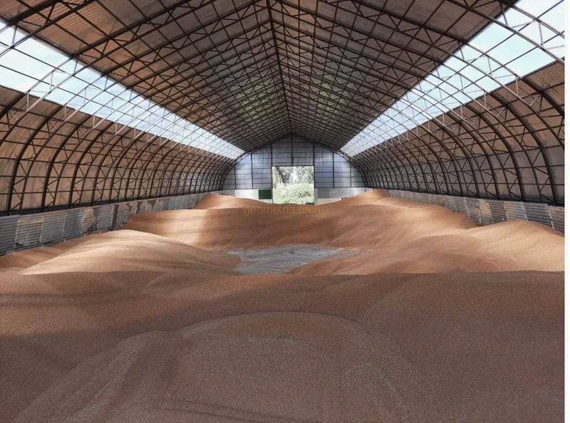 Просторный арочный ангар, идеально подходящий для хранения сельскохозяйственной продукции — в данном случае, зерна.