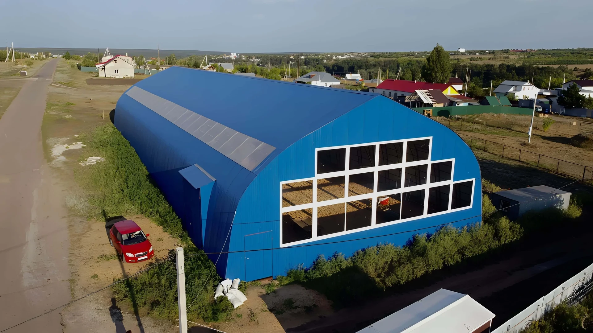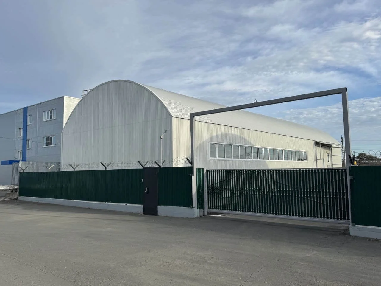 Прямостенный ангар с арочной крышей.
